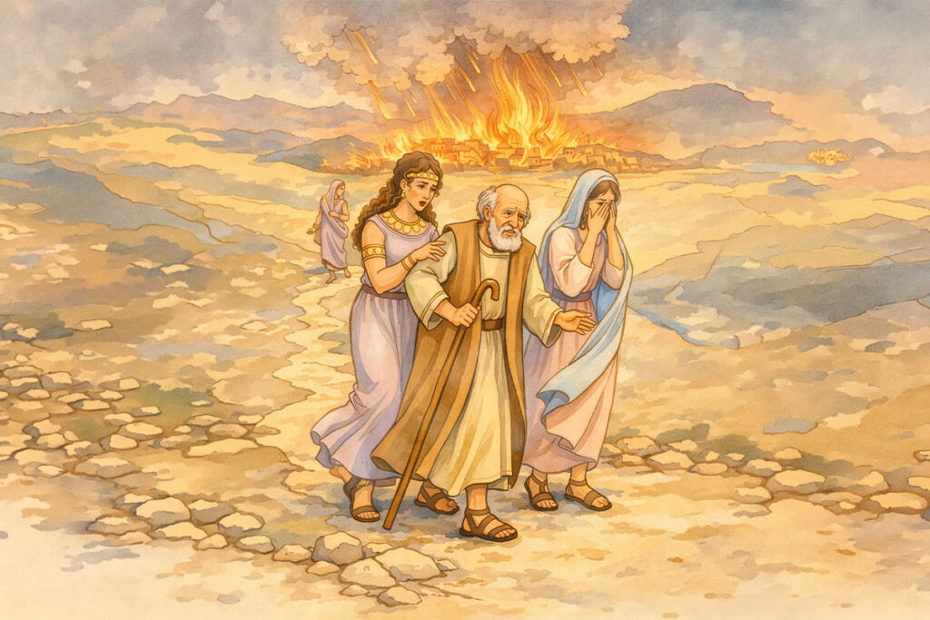 Ló ficou boquiaberto, e os anjos do Senhor tiveram de convencê-lo a deixar a cidade. Os seus rebanhos, os pastores brigões e tudo o que Ló conseguira em anos de duro trabalho ficaram para trás. Choveu fogo e enxofre e queimou tudo! Ele, sua mulher e as duas filhas saíram somente com a roupa do corpo